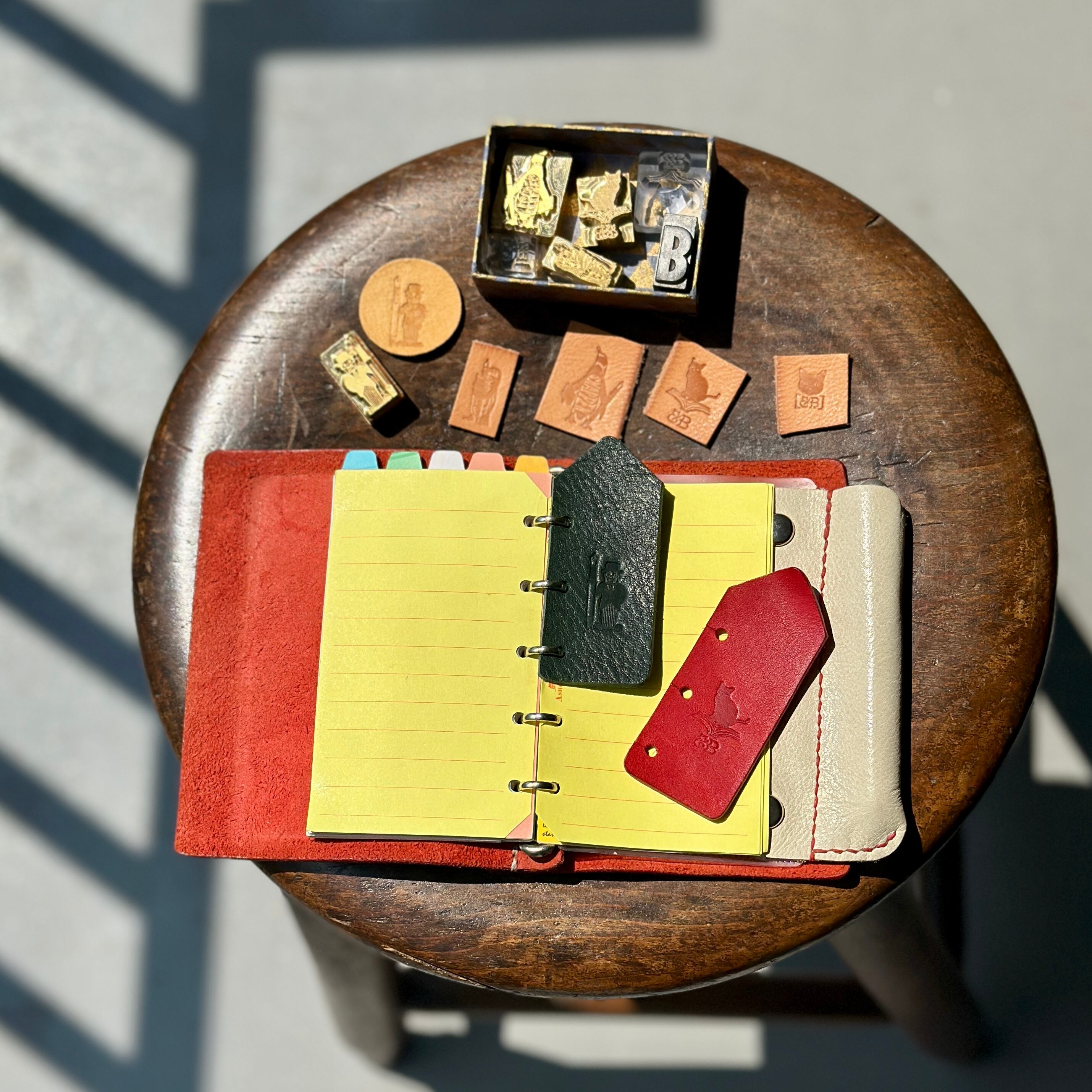 新作手帳小物「3穴ブックマーカー」は、手帳のサイズを問わず使える3穴仕様、タブにハトメを開けて栞ひもやチャームもつけられます。空押し刻印には、[&B]猫ロゴ、SNAPPEN兄弟に加えてペンズアレイタケウチの「ペンおじさん」も限定登場! もちろん、文字や記号を入れてもいいですよ。
